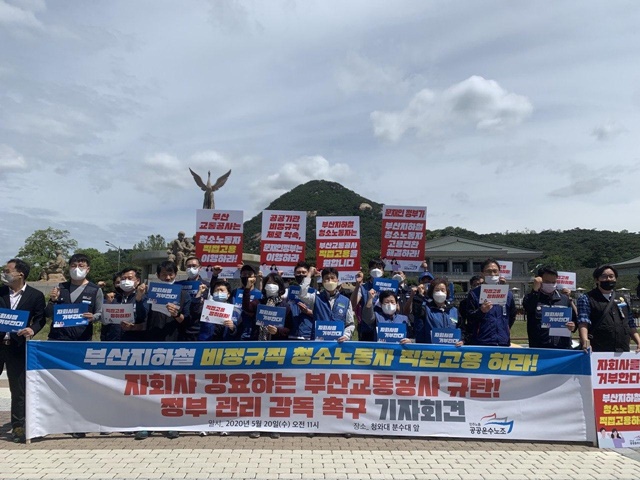 한편 부산지하철 비정규직 청소노동자들은 직접고용을 요구하며 부산시청에서 출근선전전(323일차)과 부산 시청역 농성(111일차)을 진행 중이다. 아울러 공공운수노조는 직접고용 정규직 전환을 요구하며 오는 22일 부산시청 앞에서 ‘공공운수노조 영남권 노동자대회’를 연다.