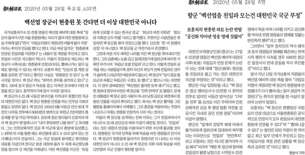 조선일보는 5월 28일 6면에 “향군 ‘백선엽을 친일파 모는 건 대한민국 국군 부정’”이란 제목으로 간도특설대 출신 백선엽을 또다시 엄호하고 나섰다. 조선일보는 백선엽을 대한민국 국군 창군 멤버로 6.25전쟁 때 낙동강 방어선인 ‘다부동 전투’를 승리로 이끌고, 평양 진공 작전의 선두에 선 영웅으로 평가했다. 조선일보는 이날 2단짜리 작은 기사에 그치지 않고, ‘백선엽 장군이 현충원 못 간다면 더 이상 대한민국 아니다’는 제목의 사설로도 백선엽을 엄호했다.