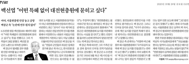 그러나 다음날인 5월 29일 중앙일보는 10면에 “백선엽 ‘어떤 특혜 없이 대전현충원에 묻히고 싶다’”제목의 기사에서 전날 조선일보가 인용한 보훈처의 ‘파묘’ 발언은 사실이 아니라고 사실상 정정했다. 중앙일보는 다음과 같이 보도했다. 백 장군 측 관계자는 보훈처 측이 ‘백 장군이 현충원에 안장됐다가 뽑혀 나가는 일이 생길까 걱정된다’고 했다는 일부 언론 보도에 대해 “그런 발언은 듣지 못했다”고 했다.