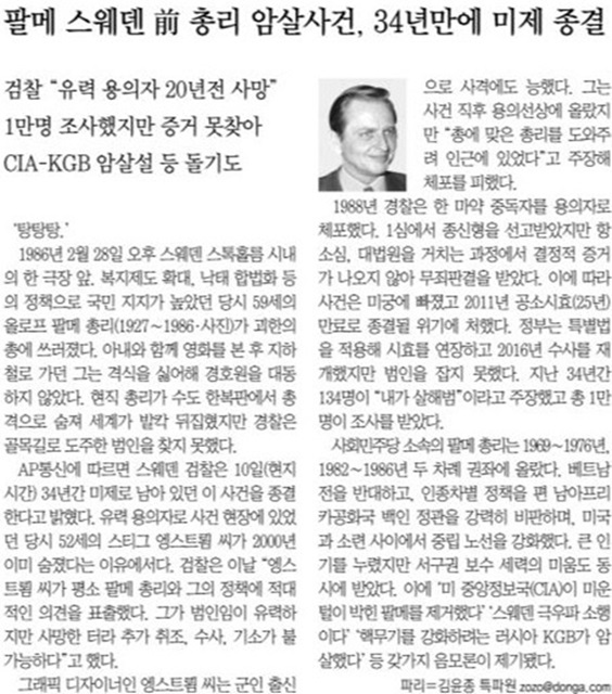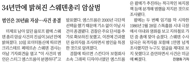 스웨덴 검찰이 지난 10일 34년간 미제로 남았던 팔메 암살사건을 종결한다고 발표했다. 11일 매일경제신문이 12면에 ‘34년 만에 밝혀진 스웨덴총리 암살범’이란 제목으로 이를 단신 보도했다. 다음날인 12일엔 동아일보가 18면에 ‘팔메 스웨덴 前 총리 암살사건, 34년 만에 미제 종결’이란 제목으로 역시 짧게 보도했다. 매일경제는 암살범이 밝혀졌다는 쪽에 비중을 뒀지만, 동아일보는 ‘미제 종결’에 방점을 찍었다.