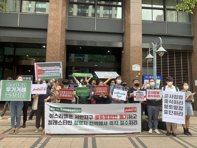 40개 시민사회단체 및 시민 266명은 1일 오전 10시 주한이스라엘대사관 앞에서 기자회견을 열고 “영토 병합은 정의상 강제적이고 일방적인 것으로, 무력에 의한 영토 획득을 금지하는 유엔 헌장을 비롯한 국제법에 정면으로 위배한다”라고 지적했다.
