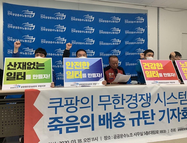 ▲ 난 3월 18일 열린 '쿠팡의 무한경쟁 시스템, 죽음의 배송 규탄' 기자회견. 제일 왼쪽 정진영 쿠팡지부 지부장 [출처: 은혜진 기자] |