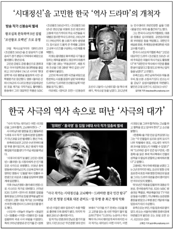 2016년 4월 MBC 대하드라마 ‘조선왕조 500년’을 집필한 방송 작가 신봉승씨가 별세했을 때도 그는 ‘작가’였다. 사람들은 신봉승 작가를 ‘방송 작가’로 불렀지만, 정작 그는 60년대 초 현대문학에 시와 평론을 발표하며 등단한 문학평론가였고, 영화 ‘돌아온 산하’(1962)의 시나리오 공모에 당선돼 작가의 길로 들어섰으니 시나리오 작가를 먼저 했다. 그러나 신 작가는 무엇보다도 1983년부터 1990년까지 MBC에서 빛을 본 ‘조선왕조 500년’ 연작 드라마로 꽃을 피웠다. 드라마 대본 집필 전에 사료를 꼼꼼히 살폈던 그는 역사가로 불러도 손색이 없었다.