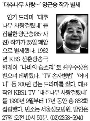 지난 25일 KBS 드라마 ‘대추나무 사랑걸렸네’를 집필한 양근승 작가가 별세했다. 양 작가는 1962년 KBS 드라마 ‘나비의 숨소리’로 데뷔해 ‘TV 손자병법’ ‘어머니’ 등 200편 넘는 드라마를 썼다. 대표작 ‘대추나무 사랑걸렸네’는 1990년부터 2007년 종영까지 852화를 혼자 집필했다. 그간 PD는 8번 바뀌었지만 대본은 양씨 혼자 썼다.