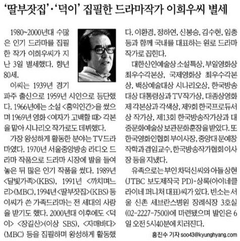 지난해 9월 별세한 이희우 작가도 드라마 ‘딸부잣집’과 ‘덕이’를 집필했지만 1959년 시인으로 등단했다. 하지만 이 작가가 가장 왕성하게 활동한 분야는 TV 드라마 작가였다. 이 작가는 1989년 ‘달빛가족’(KBS), 1991년 ‘까치며느리’(MBC), 1994년 ‘딸부잣집’(KBS) 등 주로 가족드라마로 사랑 받았다.