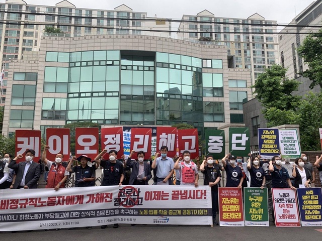 노동·법률·학술·종교 단체들은 7일 오전 서울지방노동위원회(서울지노위) 앞에서 기자회견을 열고 “지노위의 이번 판정은 정부와 노사 모두에게 재난 다음의 행보가 무엇인지, 다음의 사회가 어떤 모습인지에 대한 하나의 기준이 될 것”이라며 아시아나케이오 정리해고에 대한 부당해고 판정을 촉구했다.
