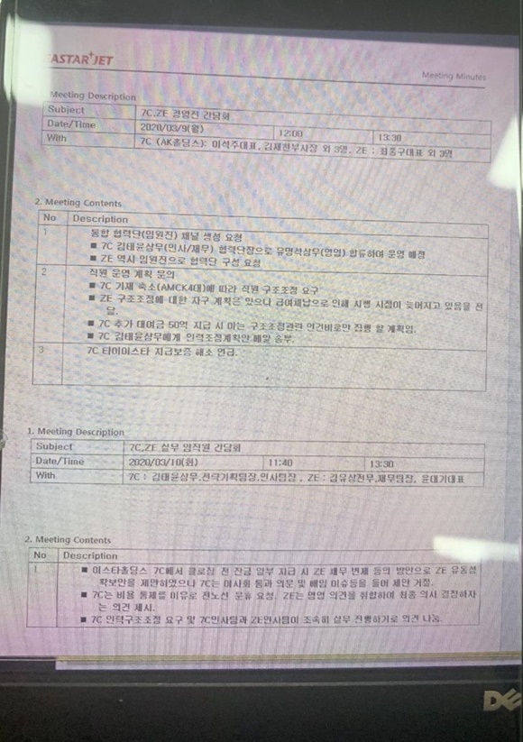 뿐만 아니라 노조는 제주항공과 이스타항공 경영진의 지난 3월 10일 간담회 회의록을 공개하며 제주항공의 지휘 하에 이스타항공 구조조정이 진행됐다고 강조했다. 회의록에 “기재 축소(AMCK 4대)에 따라 직원 구조조정 요구”, “추가 대여금 50억 지급 시 구조조정 관련 인건비로만 집행할 계획임”, “김태윤 상무에게 인력조정 계획안 메일 송부할 것” 등의 내용이 적혀 있기 때문이다.