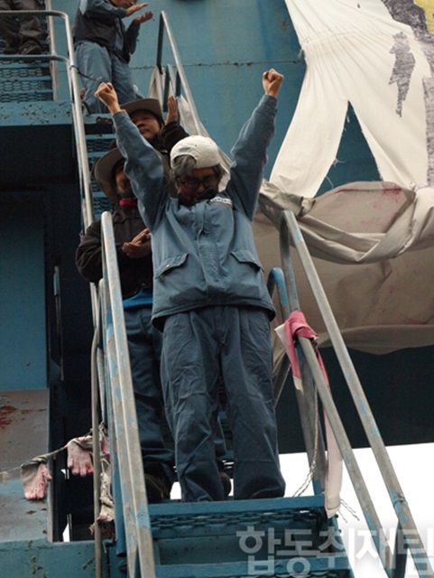 1987년 민주노조 깃발이 조합원들의 우렁찬 함성과 함께 영도다리를 건넜을 때, 노동자 세상이 왔구나 이제 복직도 되고 세상 걱정 없이 살겠다고 환희에 찬 팔뚝질을 했지만 그의 팔뚝질은 아직 허공에 있다. 민주노조 활동을 하다 박창수 동지를, 김주익 동지를, 곽재규 동지를, 최강서 동지를 가슴에 묻어야 했던 처절한 슬픔과 고통은 깊숙이 그의 뼈 마디마디에 새겨져 있다. 그리고 2011년, 그는 정리해고 반대 투쟁을 위해 김주익이 살아 돌아오지 못했던 크레인으로 올랐다.