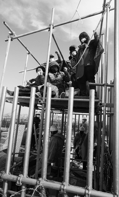 망루 위 8명의 농성자의 고통도 마찬가지였다. 이들 대부분은 고령 여성들이었다. 이들은 6층 높이의 한 평도 안 되는 망루 위에서 눕지도, 앉지도 못한 채 얼어붙은 옷을 입고 덜덜 떨어야 했다. 사다리를 치워 내려올 수도 없는 상황이었다. 밑에는 수십 명의 용역과 수협 직원이 지켜보고 있어 소변보는 것조차 어려웠고, 심지어 이들이 임시로 사용하는 용변기를 뺏는 만행도 저질렀다.