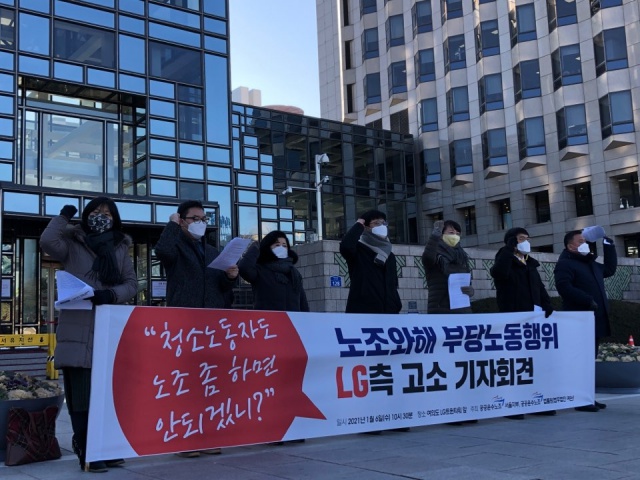6일 오전 서울 영등포구 여의도동 LG트윈타워 앞에서 공공운수노조 서울지역공공서비스지부가 기자회견을 열고 “고용노동부의 LG 측 부당노동행위에 대한 엄정 수사와 진실 규명을 촉구한다”고 밝혔다.