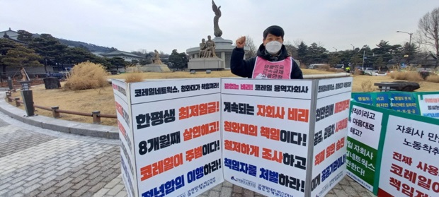 ▲ 1월 21일 청와대에서 피켓팅 중인 주차 기간제 해고노동자 김욱 씨. 2019년에 이어 두번째 해고를 당해 복직투쟁을 하고 있다 [출처: 연정] |