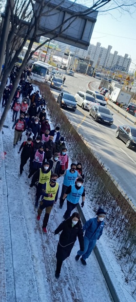 2월 3일 경기도 평택시 진위역 앞. 김진숙 지도위원과 함께 하는 희망뚜벅이 30일 차 시작에 앞서 단체사진 촬영을 하고 있다. 출발하려는데 김진숙 지도위원에게 진위역에서 역무원으로 근무하고 있는 한 노동자가 다가와 인사를 한다. 코레일의 자회사 코레일네트웍스 무기계약직인 이 노동자는 인사를 마치자 급하게 다시 역사로 들어간다. 2인 1조로 근무하고 있어 자리를 길게 비울 수가 없기 때문이다.