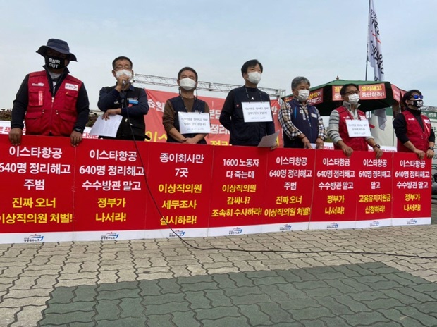 정부가 코로나19와 관련해 항공여객운송업을 ‘특별고용지원업종’으로 지정해 휴업수당의 최대 90%까지 고용유지지원금을 지원하고 있었으나 이스타항공 경영진은 이를 신청하지 않았다. 그리고 휴업 상태에서 1,600명 노동자들에게 휴업수당을 지급하지 않으며 임금체불을 계속 증가시키고, 4대 보험료를 횡령하고, 운항을 전면 중단했다. 그리고 계약해지와 희망퇴직 등을 통해 상반기에만 570여 명을 정리해고 한다. 2019년 12월 이스타항공이 제주항공과 매각 양해각서(MOU)를 체결하고, 제주항공의 경영권인수 후에도 독립조직으로 운영할 계획이라며 직원들에게 고용승계를 약속한 지 겨우 두 달이 지난 때였다.