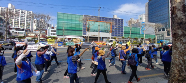 ▲ 4월 2일, 파업 결의대회를 하기 위해 대성에너지 앞으로 행진해서 오고 있는 노동자들 [출처: 연정] |
