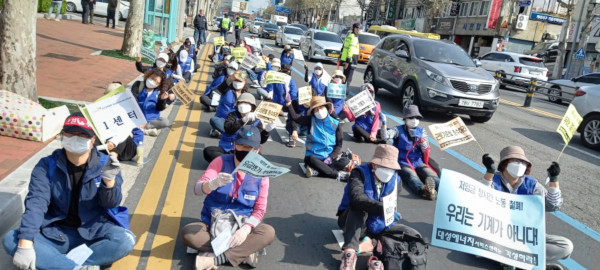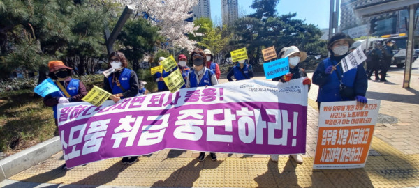 ▲ 4월 6일 2차 파업 6일차, 대구고용노동청 인근에서 시민 선전전을 하고 있는 대성에너지 검침.점검 여성노동자들 [출처: 연정] |