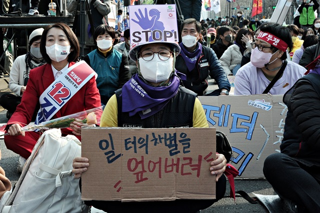 세계 여성의 날 115주년을 앞두고 한국 여성노동자들의 암울한 현실을 반영하는 지표가 발표됐다. 영국 시사주간지 이코노미스트가 지난 6일(현지 시각) 발표한 경제협력개발기구(OECD) 유리천장지수(The glass-ceiling index)에서 한국이 조사대상 29개국 중 최하위를 기록한 것이다. 해당 통계를 발표하기 시작한 2013년부터 한국은 줄곧 꼴찌에서 벗어나지 못하고 있다. 이코노미스트는 “여전히 가족과 직업 중 하나를 택해야 하는 일본과 한국의 여성이 최하위 두 자리를 채웠다”라고 평했다.