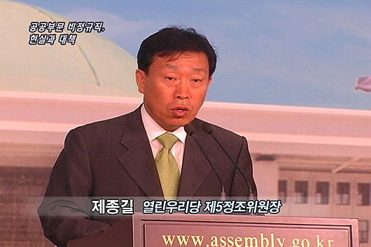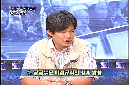 김태진/(2) 공공부문에 해당한다고 할 수 있는 여러 업종이 모든 업무를 비정규직이 수행하고 있는 실정입니다. 정부발표를 보더라도 학교비정규직, 지자체 비정규직이 가장 많고 그밖에 공기업에도 많은 비정규직이 있습니다. 학교 같은 경우에 기간제 교사는 물론 4만여명의 조리종사원을 포함해 사무·교무보조, 과학실험·전산보조 등까지10만여명이 모두 비정규직입니다. 정규직 선생님 제외하고 모두 비정규직이라고 보면 됩니다. 지자체의 경우 청원경찰, 환경미화원, 도로보수원, 공원관리원 등이 모두 비정규직입니다. 공기업에도 비정규직이 대단히 많이 확산되어 있습니다. KTX 승무원들이 대표적인 경우이겠지만, 철도나 지하철 같은 경우에도 정비, 시설, 역무 등 많은 업무를 비정규직이 담당하고 있습니다. 그밖에 발전소의 중정비, KT나 하나로통신, SKT 등의 통신설비 설치, 관리 등도 대부분 비정규직이죠. 한마디로 모든 공공부문 업무에 광범위하게 비정규직종이 필요한 실정입니다.
