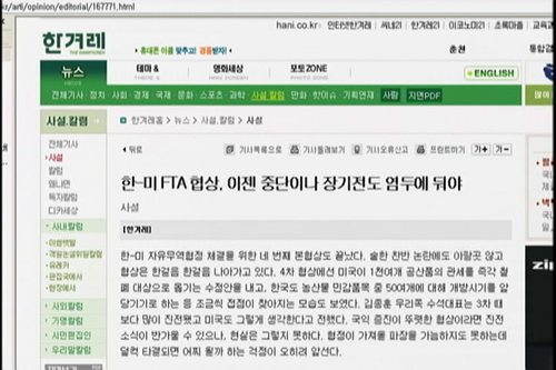 한겨레는 ‘한미FTA 협상, 이젠 중단이나 장기전도 염두에 둬야’라는 제목의 사설을 통해 “협상이 중단 될 수도 있고, 몇 년 더 갈 수도 있다는 여유를 가져야 한다”라고 신중론을 다시 한 번 제기하고 있습니다.