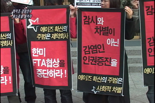 홍지은/ 감염인을 가장 힘들게 하는 것은 역시 에이즈에 대한 사회의 잘못된 인식이다. 이는 비단 일반 대중들에게만 해당되는 이야기가 아니다. 사회운동 진영에서도 에이즈에 대한 편견은 뿌리 깊다. 한미 FTA 3차 협상이 진행되고 있던 9월 9일, 탑골공원에서 보건의료대책위가 주최하는 반대 집회가 있었다. 이 때 한 노동자에게 에이즈 예방법을 비판하는 스티커를 줬더니 “나는 더러운 사람이 아닌데 왜 이걸 주느냐?”라고 말했다. 한미 FTA를 반대하는 이유인 ‘누구나 건강할 권리'에 누구보다 FTA 반대 활동을 열심히 해왔던 에이즈 환자들은 배제되어 있었던 것이다. 제약 자본과 위정자들이 에이즈를 은유하는 방식을 운동진영에서도 똑같이 사용하고 있다. 그러한 말 한 마디가 감염인들의 삶을 힘들게 하고 있다.