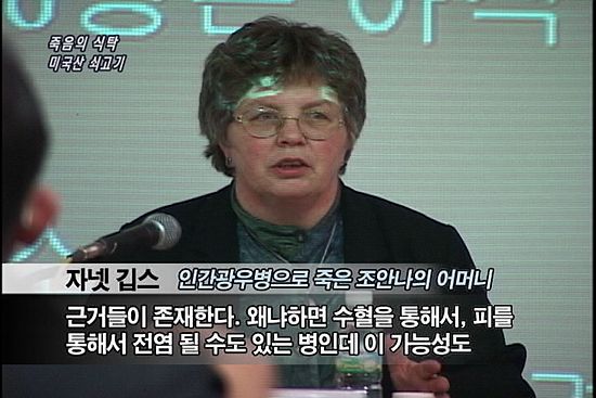 박상표/ KBS 스페셜에서 방송되었던 것처럼 미국의 공장식 축산업 방식은 필연적으로 광우병을 유발할 수밖에 없습니다. 소를 빨리 살찌우기 위해 소에게 소의 시체로 만든 육골분 사료를 먹였었고, 지금은 소의 시체를 먹이지는 않지만 소피로 만든 영양제와 돼지와 닭의 시체로 만든 육골분 사료를 여전히 먹이고 있습니다. 뿐만 아니라 돼지와 닭에게 소의 시체로 만든 육골분 사료를 여전히 먹이고 있기 때문에 교차오염으로 광우병이 발생할 가능성이 높습니다. 게다가 미국 정부에서는 0.1%의 소만을 대상으로 광우병 검사를 실시하고 있습니다. 겉으로는 멀쩡하지만 실제로 광우병에 걸린 소들을 걸러내기 위해서는 광우병 전수검사를 실시해야 합니다. 그러므로 99.9%의 미국산 쇠고기는 광우병으로부터 안전하지 않다는 것이 진실이라고 생각합니다.