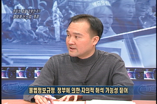 더구나 이번 개정안은 인터넷상의 시민사회운동, 혹은 진보적인 목소리를 통제하겠다는 의도로 보입니다. 앞서 일정한 경우에 정보통신부 장관의 삭제 명령이 의무화되었다고 했는데요. 그 대상이 되는 것이 국가기밀 누설이나 국가보안법 위반, 범죄를 목적으로 하는 정보 등입니다. 그런데 무엇이 국가보안법 위반이고 범죄를 목적으로 하는 정보입니까? 지금까지 우리가 많이 보아왔듯이, 북한과 관련된 게시물이나 정부 비판적인 주장 등에 대해 정부가 자의적으로 불법이라고 판단할 가능성이 높습니다. 이는 인터넷상의 진보적인 사회운동을 탄압하겠다는 것이나 다름없습니다.