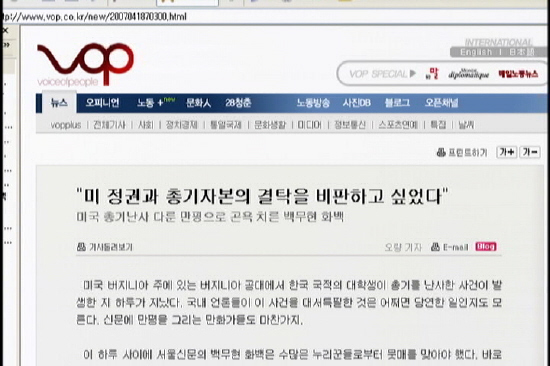 오버한 것은 개혁언론이나 진보언론도 마찬가지였는데요. 진보언론으로 불리 우는 인터넷신문 ‘민중의소리’는 “부시 정권과 미국의 총기자본의 결탁을 비판하기 위해 그린 것”이라는 백무현 화백의 인터뷰를 실었습니다. 백 화백은 최근 이번 사건을 풍자한 만평을 그려 논란이 되기도 했는데요. 부시 정권과 미국의 총기자본이 결탁이 원인이라는 점을 지적하는 기사 같지만, ‘한국과 미국’이라는 이분법에 갇혀 정작 사건의 본질을 완전히 빗겨간 전형적인 기사입니다.