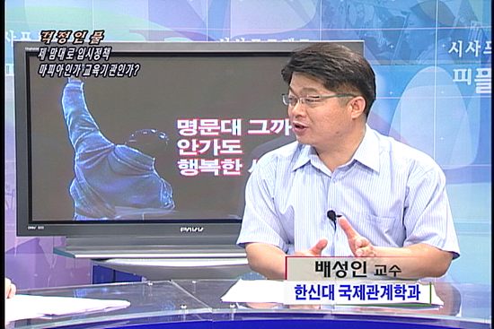 배성인/ 원래 교육부는 2008년 입시를 공교육 정상화의 원년으로 삼고, 내신 50% 이상 반영 등 학교생활기록부 위주의 선발을 강력히 권고해 왔습니다. 그런데 이러한 방침에 반기를 든 거죠. 교육부의 입장에서는 닭 쫓던 개 신세가 된 거죠. 아니 내신 4등급까지 만점을 준다는 것은, 사실상 내신의 변별력을 없애는 방안입니다. 그렇지 않습니까. 학교 공부 뭐 대충 하지 뭐 하러 1등급 받으려고 아등바등합니까. 그냥 정시에서 수능 잘 보고 논술과 면접 준비 잘 하면 되죠. (약간 흥분한 어조로).