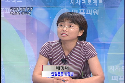 하주영/오늘 국기에 대한 경례와 맹세를 이야기하면서 대한민국을 휩쓸고 지나간 여러 일들이 떠오르는데요. 이라크에서 죽음을 당한 김선일씨, 그리고 비정규직법안으로 해고되고 투쟁하는 민중들과 한미 FTA로 인해 고통을 겪을 많은 국민들에게 대한민국이란 국가는 어떤 존재일까요? 위에 계신 분들, 왼쪽 가슴에 손을 얹고 차분히 생각해보시길 바랍니다.
