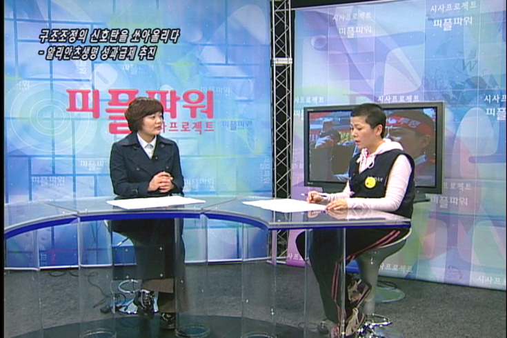 김서영/ 사측은 노동조합과의 약속인 단체협약을 어기고 임금체계를 불법 변경했습니다. 저희 단체협약 40조에 의하면 회사는 조합원에 대한 임금의 제정, 변경 및 승급률의 기준을 정함에 있어서는 사전에 조합과 “합의”하도록 되어 있습니다. 하지만 사측은 노동조합과의 약속인 단체협약을 어기고 임금체계를 일방적으로 불법 변경한 것입니다. 그렇기 때문에 전 조합원이 사측의 이러한 불법에 항거하여 파업을 결정하였던 것입니다. 성과급제 도입은 이미 2005, 2006년 합의를 통해 노동조합 역시 이 제도 도입에 적극 협조하기로 합의서까지 노사공동으로 작성한 바 있습니다. 회사가 이러한 합의서마저 무시하고 조합원의 98%가 반대한 성과급제(안)을 일방적으로 도입한 것은 노사 양측이 수용할 수 있는 안으로 한다는 합의를 스스로 지킬 수 없었기 때문입니다.