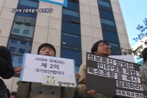 하주영/ 현장플러스 시간입니다. 오늘 현장플러스에서는 최근 논란이 되고 있는 한나라당 의원들이 제개정을 예고한 이른바 사이버 3대악법에 대해 들어봅니다. 먼저 정보인원 시민사회단체들이 왜 반대하는 지 기자회견을 다녀왔습니다. 기자회견 영상부터 시작합니다.