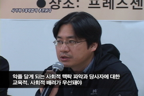 이지은/ 최근 뜻하지 않은 사건들로 악플에 대한 집중조명이 많았습니다.악플이 나쁘다는 것은 누구나 압니다. 그리고 그것은 없애야 한다는 것도요. 하지만 이 사이버통제법이 악플을 방지하는 최선의 방법은 아니라는 것은 다들 공감하는 것 같습니다. 악플방지라는 명분을 가지고 인터넷의 순기능을 통제하려는 것에는 반대한다는 네티즌들의 움직임이 더 많은 것 같습니다.