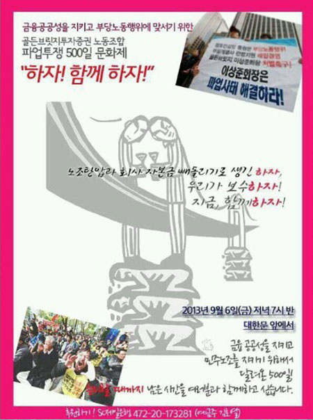 * 골든브릿지파업 투쟁 500일 문화제가 9월 6일(금) 저녁 7시반 대한문에서 열립니다. 골든브릿지 투쟁에 함께해왔던 많은 분들, 그리고 앞으로도 골든브릿지 투쟁을 지켜나갈 많은 분들의 참여를 기다립니다. 꼭 함께해주세요.