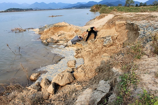 ▲ 측방침식으로 연약해진 낙동강 둔치를 거닐다 둔치가 붕괴돼 물에 빠져 죽을 뻔한 기자가 겨우 구조돼 나오고 있다 |