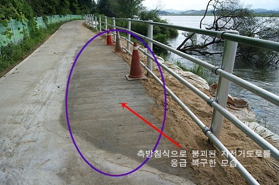 ▲ 측방침식으로 2013년 7월 이미 한차례 붕괴된 것을 응급복구한 모습 |