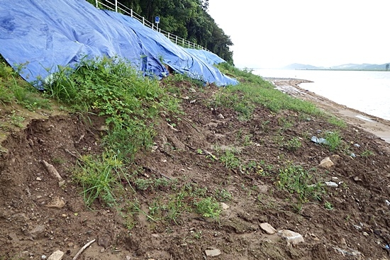 ▲ 이번 늦은 장마에 측방침식으로 자전거도로 사면이 붕괴된 것을 방수포로 덮어놓았다 |