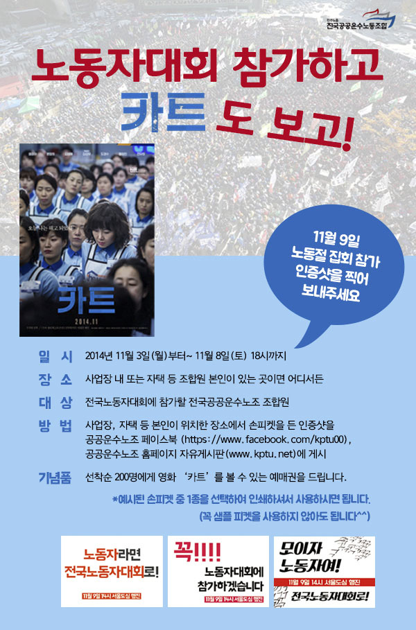 공공운수노조는 조합원을 대상으로 ‘노동자 대회에 참가하고 ’카트‘도 보고’라는 행사를 통해 노동자대회 참가 인증샷을 찍은 조합원 200명에게 영화 ‘카트’예매권을 드립니다.