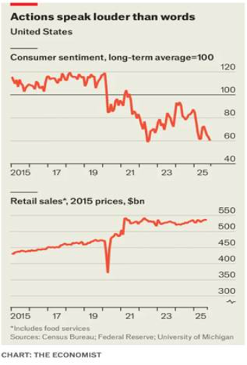 <말보다 행동이 더 많은 것을 말해준다>, 상단 그래프 – 소비자 심리 (장기 평균 = 100), 하단 그래프 – 소매 판매 (2015년 가격 기준, 단위: 십억 달러), 출처: Census Bureau; Federal Reserve; University of Michigan, 그래프 제작: THE ECONOMIST