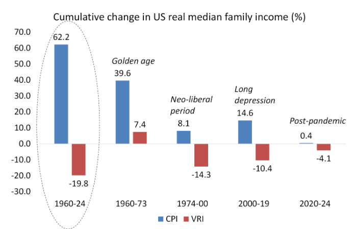 <미국 실질 중위 가족소득의 누적 변화율 (%)>, 파란색(CPI): 소비자물가지수 기준 실질소득 변화, 빨간색(VRI): 가치기반 인플레이션율(Value Rate of Inflation, VRI) 기준 실질소득 변화, 1960-2024, 1960-1973 (Golden age / 황금기), 1974-2000 (Neo-liberal period / 신자유주의 시기), 2000-2019 (Long depression / 장기침체기), 2020-2024 (Post-pandemic / 팬데믹 이후)