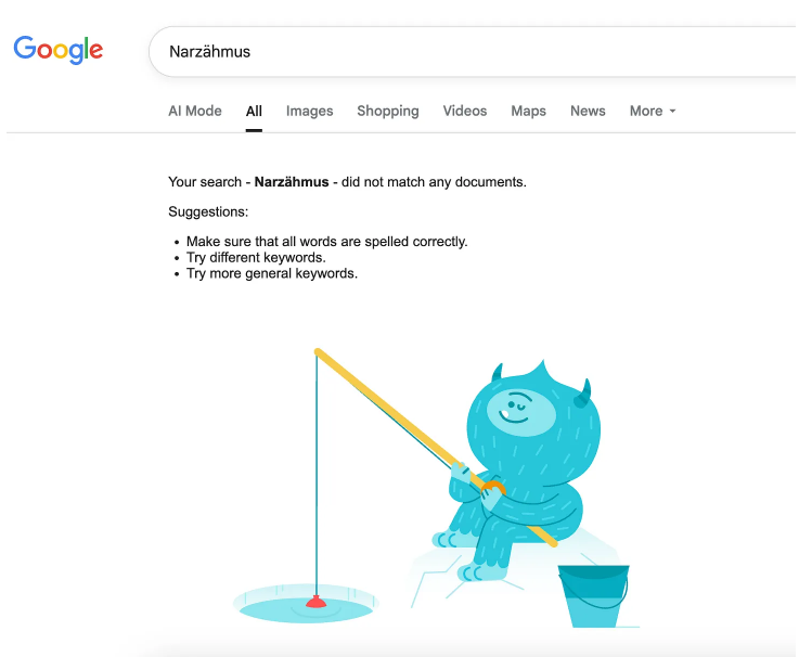 이것은 꽤 흥미로운 아이디어다. 어쩌면 “narcitaming(나르지밍?)”은 하나의 개념이 될 수도 있다. 나는 슬로터다이크 전문가가 아니라서, LLM이 실제 어디선가 이 표현을 찾아냈는지 확신할 수 없다. 혹시 다른 독자들이 더 잘 알지도 모른다. 하지만 ‘Narzähmus’나 ‘narcitaming’을 검색해보면 나오는 결과는 바로 다음과 같다: 없음.