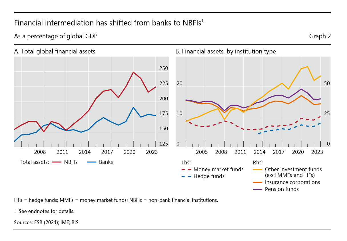 은행의 대차대조표가 비교적 완만하게 성장하는 동안, 헤지펀드·투자펀드·연기금·자산운용사 등 비은행 금융기관(NBFI)은 훨씬 더 급격히 성장했다.