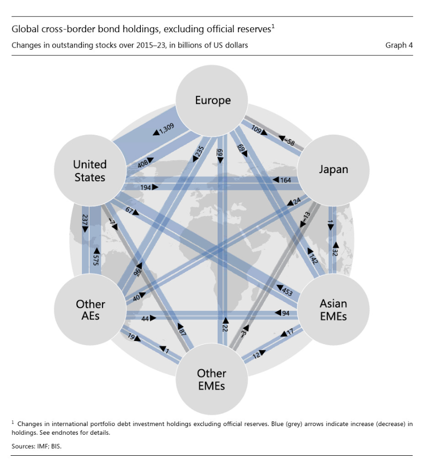 2015년부터 2023년 사이 유럽과 다른 선진국들이 미국 국채를 매입하는 형태로 미국에 순대출한 금액은 1조 2천억 달러 늘어났는데, 이는 같은 기간 아시아 신흥국이 미국에 대해 늘린 청구권 증가분의 세 배에 해당한다. 이는 달러 체제의 새로운 축과 ‘달러 함정’에 대해 다룬 차트북 397에서 제기한 주장과 정확히 맞아떨어진다. 그 뉴스레터에서 나는 달러 체제의 진화하는 지정경제학적 논리에 관심을 두었다. BIS 보고서는 금융 시스템 작동에 미치는 영향을 생각해볼 수 있는 기회를 제공한다.