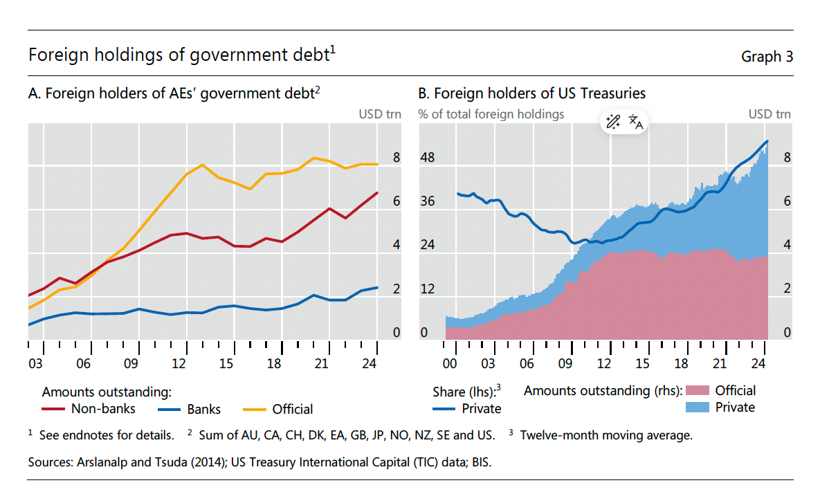 BIS가 주목하는 핵심은 세계 최대 규모의 국채 시장, 즉 미국과 일본의 국채 시장(현재로서는 유로존은 덜 해당한다)이다. 이들 시장에서는, 상호펀드·상장지수펀드(ETF), 연기금·보험사·국부펀드 같은 장기 기관투자가, 그리고 헤지펀드 등 고도화된 선진국 비은행 금융기관의 복잡한 거래가 불안정성을 일으키거나 금융 여건의 급격한 긴축을 촉발할 가능성이 우려된다.