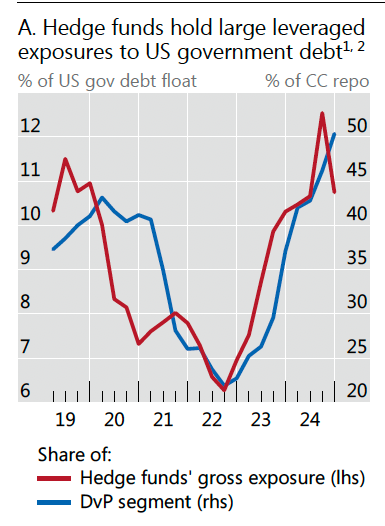예를 들어, GFC 이후 브로커-딜러의 대차대조표 규모가 금융 시스템에서 줄어든 상황에서, 국채시장의 유동성은 점점 더 개방형 상호펀드, 헤지펀드, 기타 자산운용사에 의존하고 있다. 이들 기관은 종종 심각한 유동성 불일치를 겪고, 국채를 담보로 한 단기 자금조달에 의존하거나, 매우 높은 레버리지를 쓰거나, 레버리지와 유사한 행태를 보인다. 그 결과 이들의 유동성 공급은 덜 안정적이며, 시장 스트레스 시기에 쉽게 사라질 수 있다. 특히 헤지펀드는 국채시장에서 점점 더 중요한 경기순응적(procyclical) 유동성 공급원으로 자리 잡고 있다. 이들은 관련 금융상품 간의 작은 가격 차이를 이용하려는 상대가치(relative value) 거래 전략을 적극적으로 구사한다. 이런 작은 가격 차이에서 수익을 극대화하기 위해 그들은 포지션에 큰 레버리지를 건다. 흔히 쓰이는 방법 중 하나는 국채를 담보로 레포시장(repo market)에서 더 많은 현금을 빌린 뒤, 그 현금으로 추가 국채를 사는 것이다. 최근 몇 년 동안 이 관행은 담보의 시장가치와 같거나 그 이상을 빌리는 방식으로 진화했는데, 이는 현금 대출자를 시장 위험으로부터 보호하는 할인율(haircut) 없이 자금을 조달하는 것이다. 이렇게 되면 차입자는 더 많은 레버리지를 얻을 수 있지만, 할인율이 조금만 올라가도 강제 매도가 발생해 시장 전체가 붕괴될 위험에 노출된다. 헤지펀드의 영향력 증가는, 예를 들어 그들의 미국 국채 총익스포저가 이제 발행 잔액의 10%를 넘어선 것(그래프 13.A, 빨간선)과, 레버리지 투자자를 대상으로 한 미국 레포시장 부문의 확대(파란선)에서 확인된다.