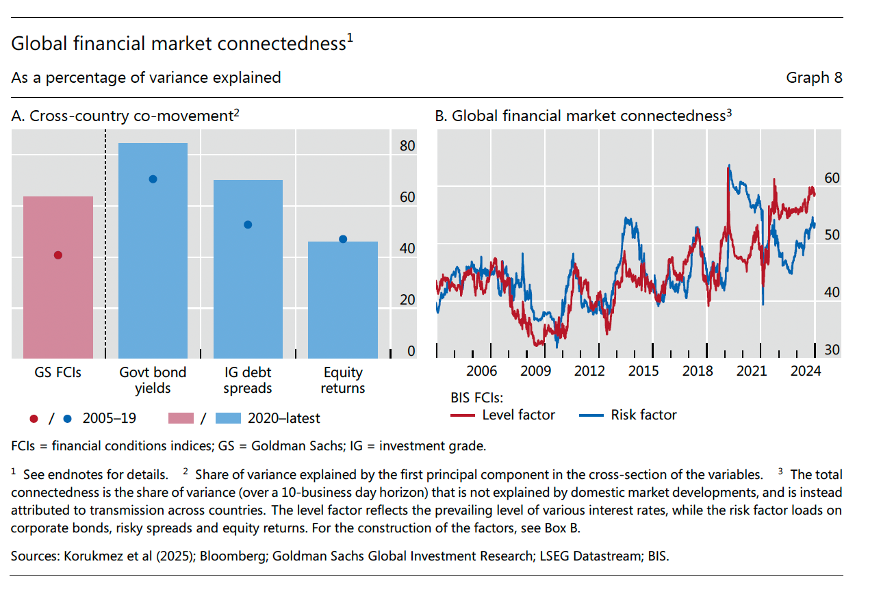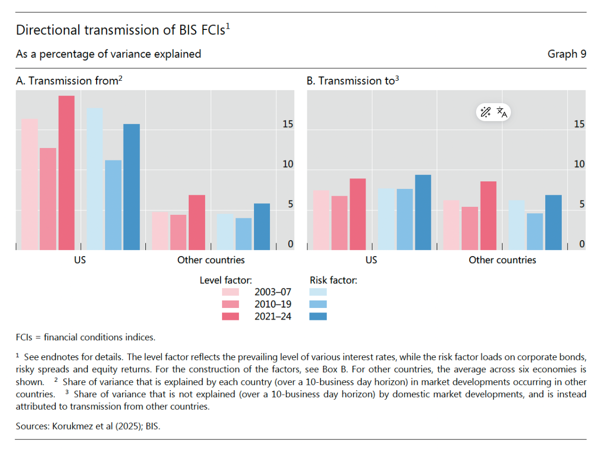 물론 미국에서 전파되는 충격은 여전히 다른 어떤 시장에서보다 훨씬 더 영향력이 크지만, 미국 역시 해외발 충격에 더 취약해지고 있다. 가장 주목할 만한 최근 사례는 2024년 8월의 엔화 캐리 트레이드 청산으로, 이는 미국 금융 여건을 작지만 뚜렷하게 긴축시키는 계기가 됐다.