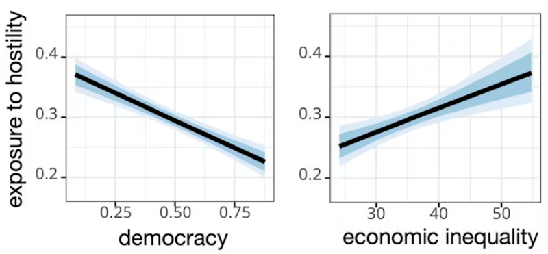 이 그래프는 30개국의 온라인 정치적 적대감 노출과 자유 민주주의 지수(V-dem) 또는 경제적 불평등 수준(세계은행 지니 추정치) 사이의 통계적 연관성을 보여준다. 출처: 보르(Bor), 마리(Marie), 프라델라(Pradella), 피터슨(Petersen), 푸르니(Fourni) 저자 제공