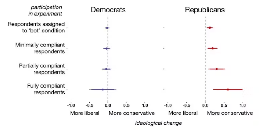사용자들은 한 달 동안 자신의 의견과 반대되는 정치적 메시지를 리트윗하는 트위터 봇(algorithm)을 팔로우하도록 초대받았다. 연구에서는 가로축을 통해 연구 참여 수준에 따라 반대 의견에 노출된 후의 이념적 변화를 나타냈다. 공화당원과 민주당원 모두 연구에 더 많이 참여할수록, 즉 반대 견해에 더 많이 노출될수록, 봇이 유포하는 콘텐츠와 반대 방향으로 기존의 정치적 태도가 강화되는 것으로 보였다. 그러나 이러한 효과는 공화당 사용자들 사이에서만 통계적으로 유의미했는데, 이는 표본 크기가 너무 작았기 때문인 것으로 보인다. 출처: 보르(Bail), 마리(Marriage), 프라델라(Pradella), 피터슨(Petersen), 푸르니(Furni) 작성자