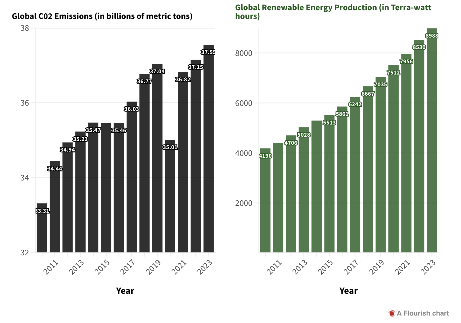 그러나 이 기념일을 맞아 끔찍한 의문을 품어보자: 만약 그 도구함 자체가 불충분하다면? 반대로, 모든 도구가 심각한 위기를 더 악화시키고 있다면? 사실, 그것이 바로 지금 일어나고 있는 일이다. 2년이 지나고 약 3,000억 달러가 투입된 지금, 우리가 목격하고 있는 것은 재생 에너지에 대한 투자가 증가함과 동시에 화석 연료 생산도 증가하고 있다는 것이다.