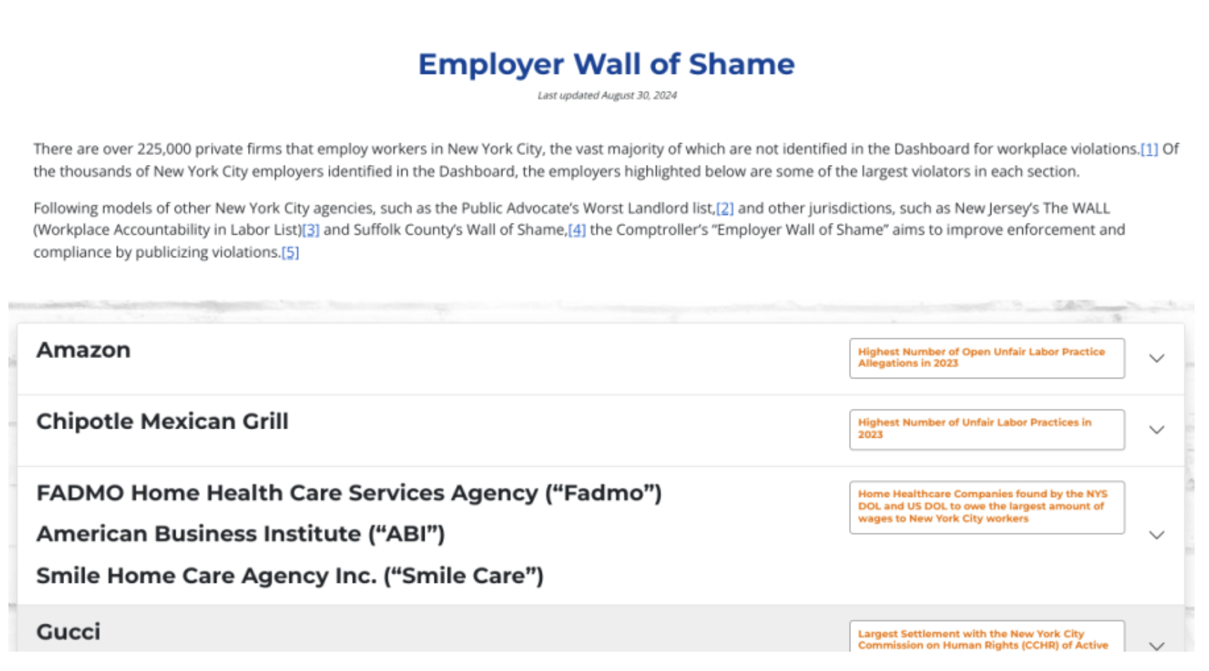 뉴욕시 감사관 사무소는 대중에게 유용한 새로운 도구를 출시했다: 도시 최악의 사장들과 그들의 다양한 노동 착취를 상세히 담은 데이터베이스와 함께하는, 이른바 "수치스러운 고용주의 벽(Employer Wall of Shame)"이다.