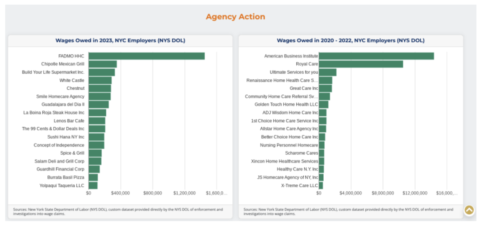 그리고 규제가 제대로 이루어지지 않는 것으로 악명 높은 산업인 홈 헬스케어 서비스 업계의 세 회사가 이 목록을 마무리 짓고 있다. 스태튼 아일랜드에 본사를 둔 패드모 홈 헬스케어 서비스 에이전시(Fadmo Home Health Care Services Agency)는 2023년 미국 노동부가 뉴욕시에서 조사한 임금 착취 위반 중 가장 큰 위반자로, 22명의 노동자에게 145만 달러 이상의 임금을 미지급했다. 퀸즈에 본사를 둔 홈 헬스케어 기관인 아메리칸 비즈니스 인스티튜트(American Business Institute(ABI))는 2020년부터 2022년까지 뉴욕주 노동부의 모든 사건 중 가장 큰 임금 착취 위반자로, 세 건의 조사에서 175명의 노동자에게 최저 임금을 지급하지 않아 1,430만 달러 이상의 금액을 지급해야 했다. 마지막으로, 브루클린에 본사를 둔 홈 헬스케어 기관인 스마일 홈케어 에이전시(Smile Home Care Agency Inc(Smile Care))는 2023년 미국 노동부가 조사한 임금 착취 위반 중 가장 큰 위반자로, 246명의 노동자에게 42만 7천 달러 이상의 미지급 임금을 지고 있었다.