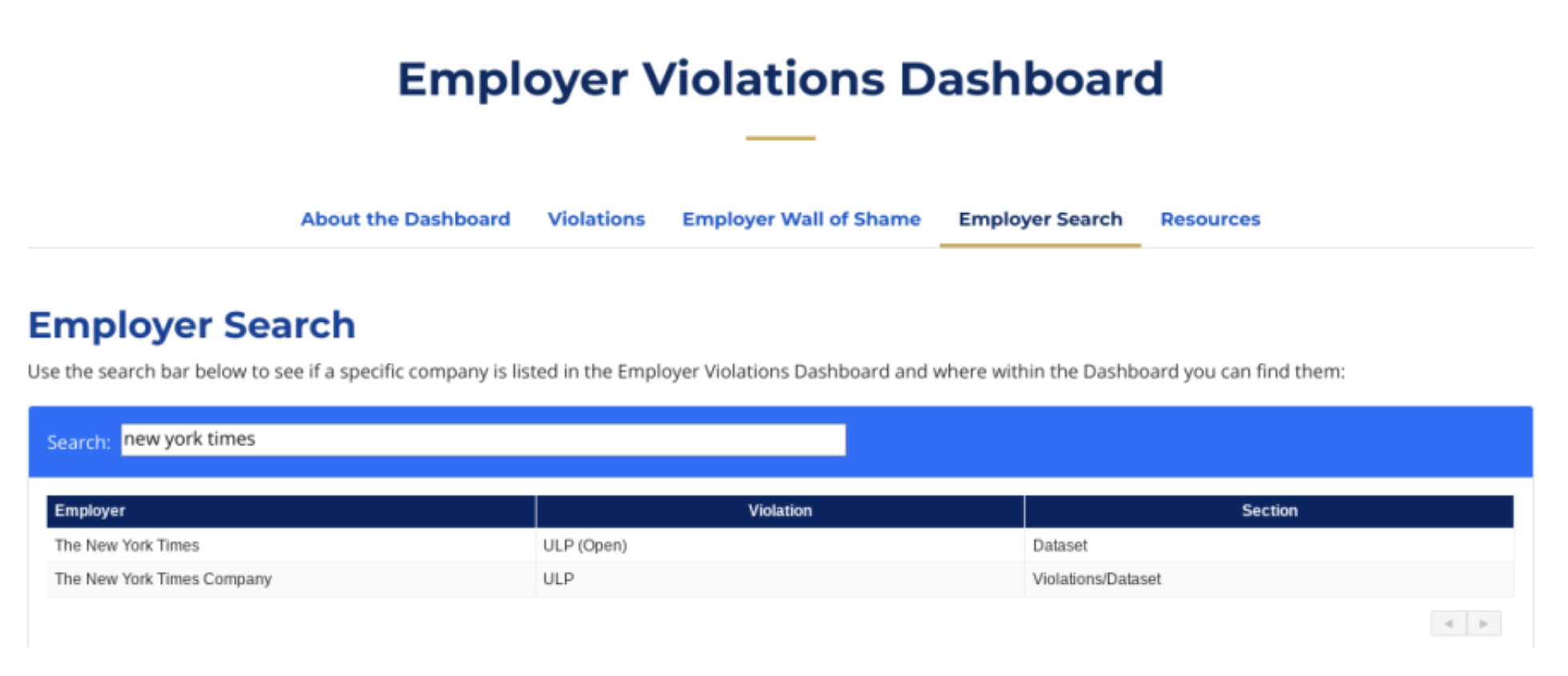 출처: 뉴욕 노동(법규) 위반 대시보드의 고용주 검색 기능 화면 갈무리